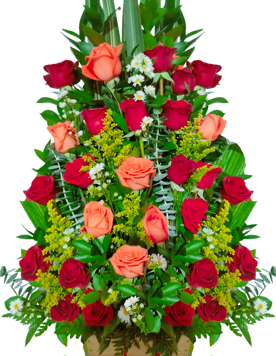 Arreglo vertical con rosas rojas y salmón, detalles silvestres y follaje estructurado, elegante y llamativo.
