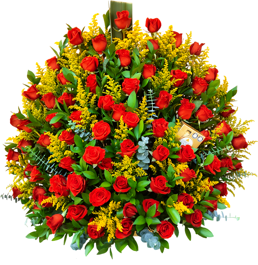 Explosión Rubí Dorada es un arreglo impactante, vibrante y lleno de energía, diseñado para quienes quieren regalar algo grande, elegante y muy llamativo. Su composición está dominada por abundantes rosas rojas intensas, acompañadas de solidago dorado que aporta brillo, textura y contraste, y follajes finos que elevan el volumen del diseño.