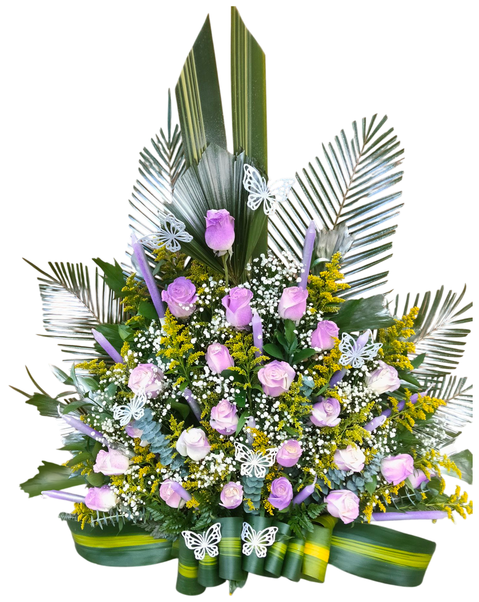 El arreglo se enriquece con nubes de gypsophila blanca, toques de solidago amarillo y follajes estructurados con acabado plateado que crean un marco moderno y estilizado. Las mariposas decorativas y velas en tono lila aportan un aire mágico y delicado, convirtiéndolo en una pieza verdaderamente especial.