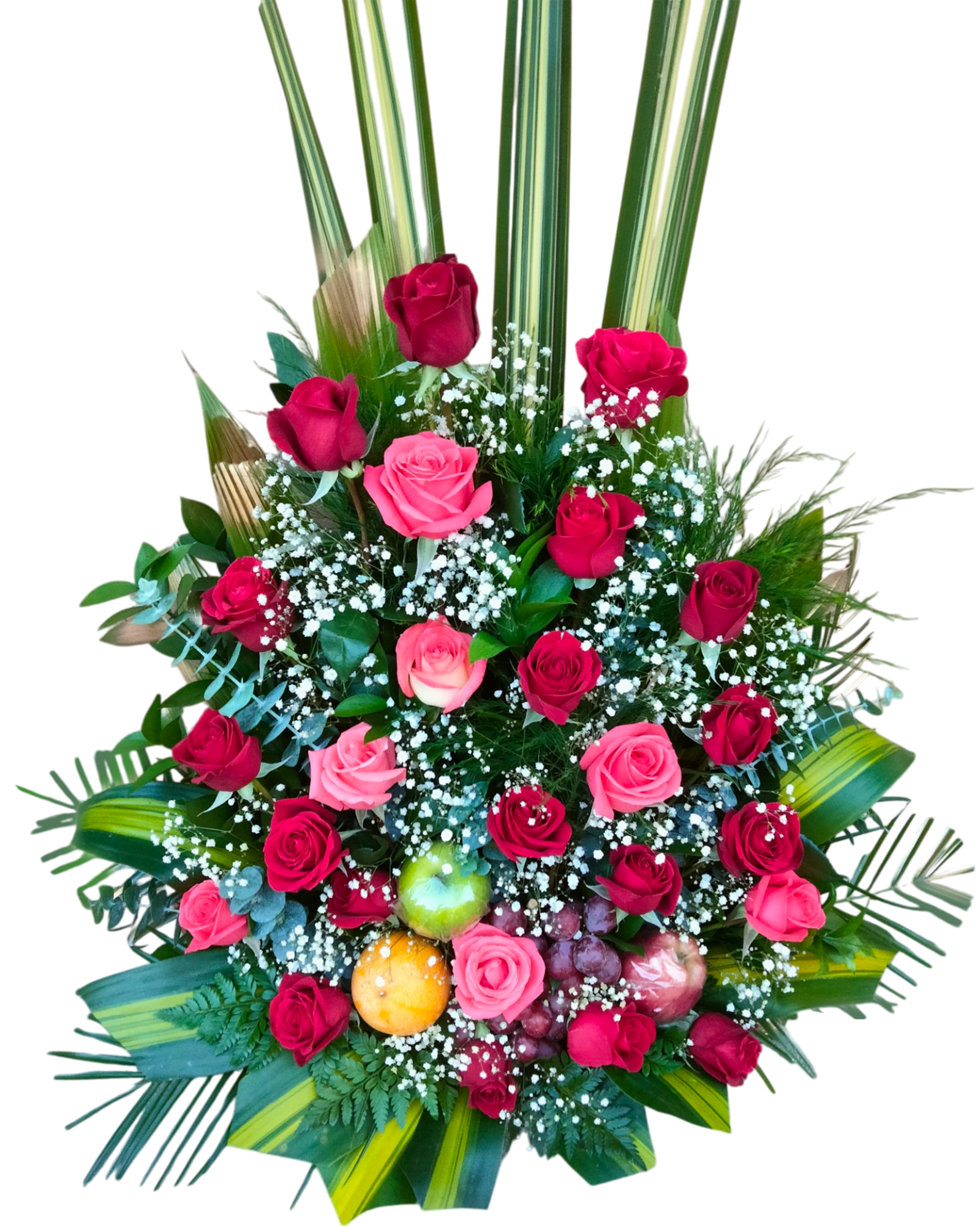 El diseño se complementa con delicados toques de nube blanca (gypsophila) que aportan textura y ligereza visual, junto con follaje estructurado que enmarca la pieza y le da presencia imponente. En la base, frutas frescas como uvas, manzana verde y naranja añaden un detalle especial que simboliza abundancia, prosperidad y buenos deseos.